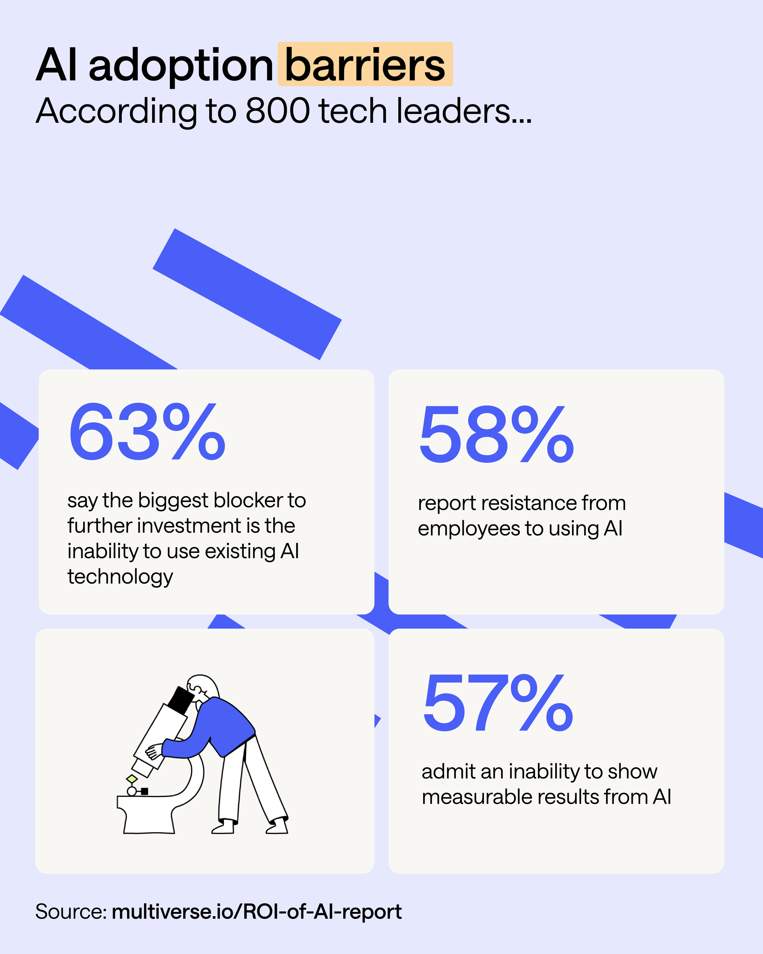 Of all the AI adoption barriers cited by leaders, 63% say the biggest blocker to further investment is the inability to fully use existing AI technology. Paired with more than half (58%) reporting resistance from employees to use AI and a lack of ability to demonstrate or predict tangible results (57%), it’s clear we’re at a standstill.