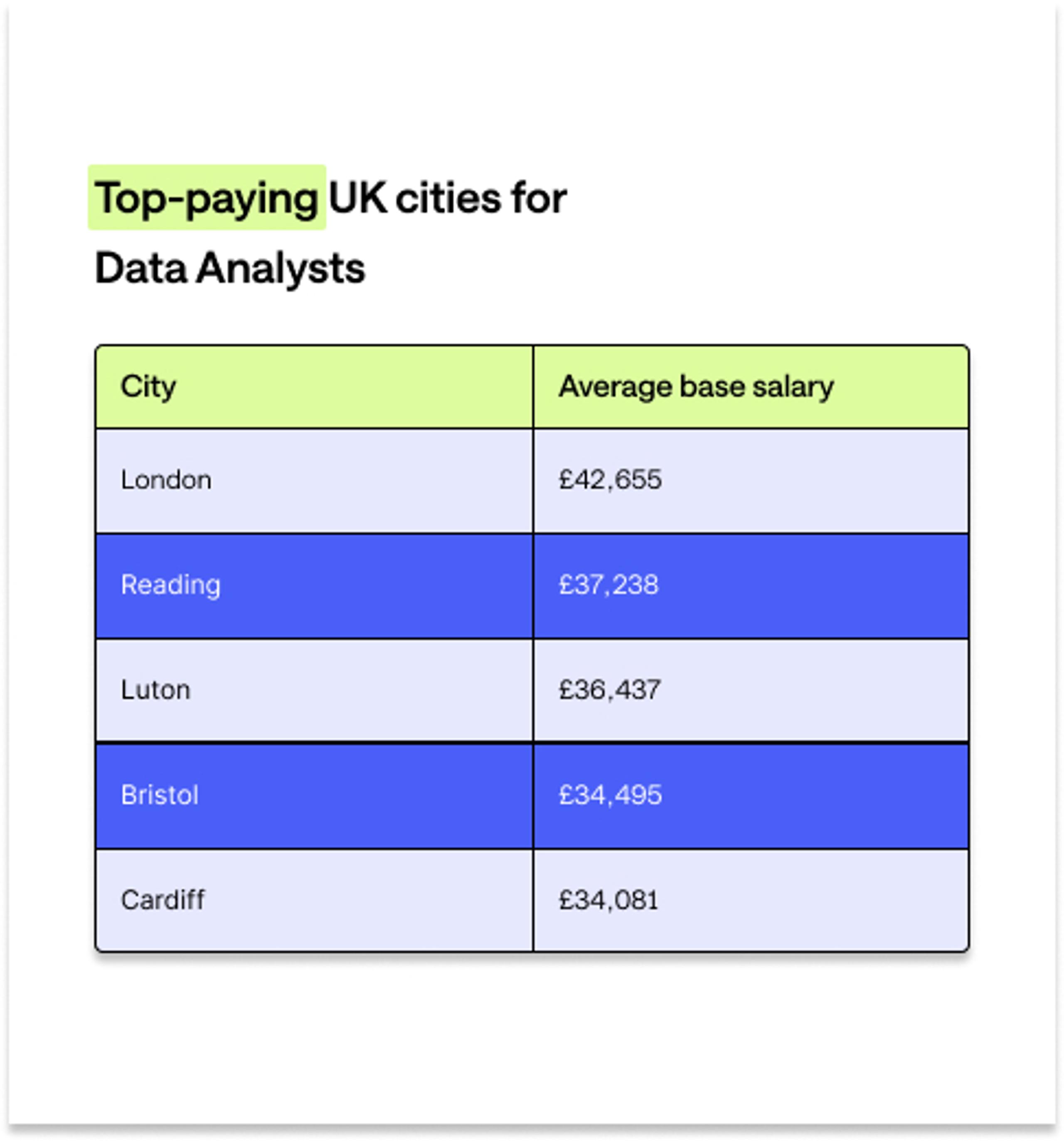 According to Indeed, the five highest-paying cities for Data Analysts in the UK are: